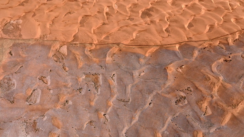 這是6月30日在寧夏中衛(wèi)市長(zhǎng)流水村拍攝的騰格里沙漠東南緣治沙鎖邊工程現(xiàn)場(chǎng)(無人機(jī)照片)。