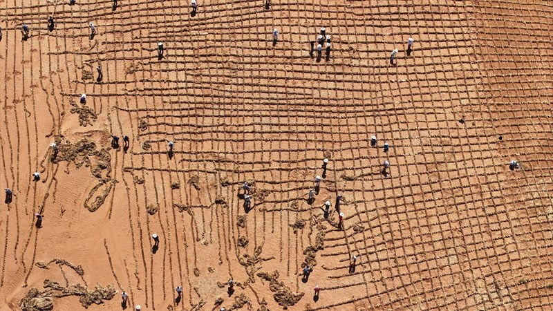 6月30日,在位于寧夏中衛(wèi)市長(zhǎng)流水村的騰格里沙漠東南緣,隨著治沙工人將最后一列草方格穩(wěn)穩(wěn)扎下,這項(xiàng)跨越半個(gè)世紀(jì)的治沙工程,在騰格里沙漠寧夏境內(nèi)實(shí)現(xiàn)全面“鎖定”。一條長(zhǎng)153公里、最寬處達(dá)38公里的固沙鎖邊帶蜿蜒開來。