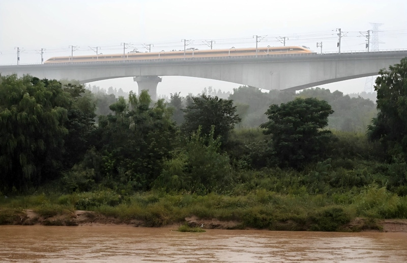 9月11日,聯(lián)調(diào)聯(lián)試綜合檢測列車駛過位于陜西省西安市的西延高鐵渭河特大橋。