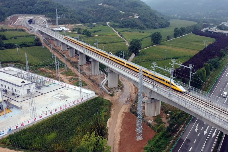 9月11日,聯(lián)調(diào)聯(lián)試綜合檢測列車駛過位于陜西省銅川市的西延高鐵王家河特大橋。