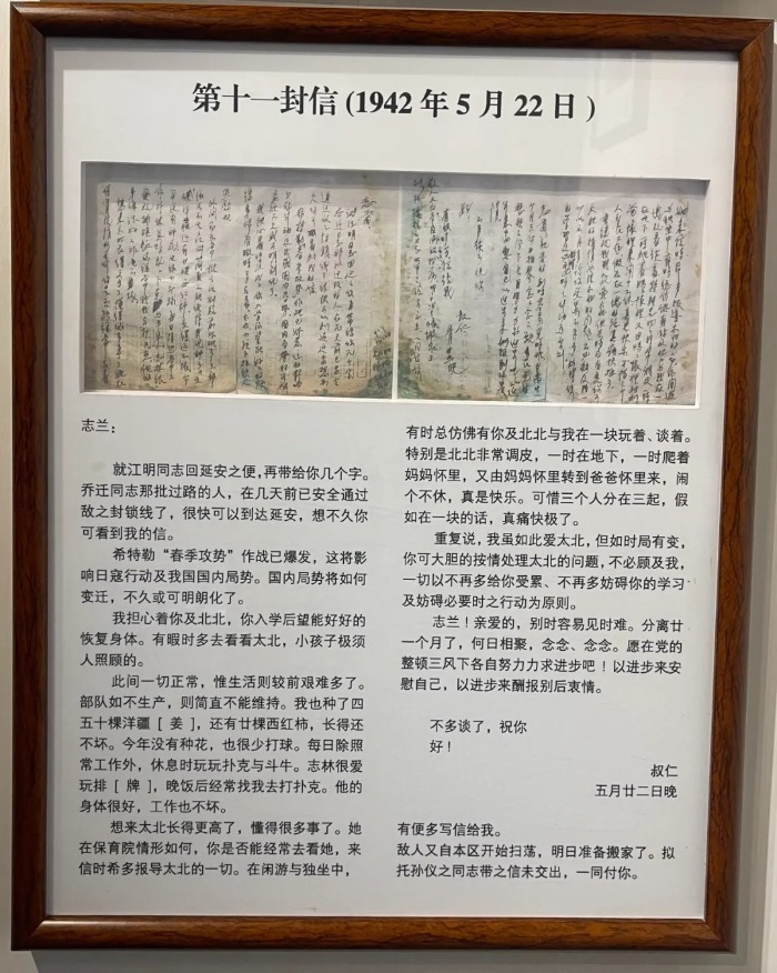 “前述郭述申同志帶給你的一包東西:有幾件衣服幾張花布一封信,聽說過封鎖線時都丟掉了,可惜那幾張不壞也還好看,想著你替小太北做成衣服后,滿可給小家伙漂亮一下,都掉了,這怪不得做爸爸的,只是小家伙運氣太不好了?!?/p>