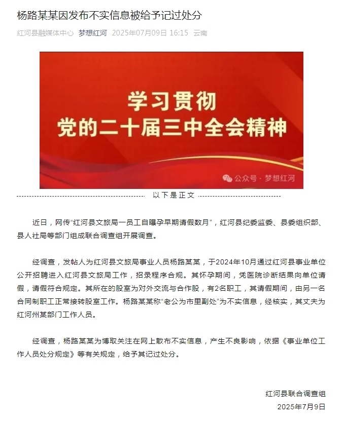 經(jīng)調查,發(fā)帖人為紅河縣文旅局事業(yè)人員楊路某某,于2024年10月通過紅河縣事業(yè)單位公開招聘進入紅河縣文旅局工作,招錄程序合規(guī)。其懷孕期間,憑醫(yī)院診斷結果向單位請假,請假符合規(guī)定。其所在的股室為對外交流與合作股,有2名職工,其請假期間,由另一名合同制職工正常接轉股室工作。楊路某某稱“老公為市里副處”為不實信息,經(jīng)核實,其丈夫為紅河州某部門工作人員。