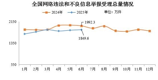 2025年6月全國受理網(wǎng)絡(luò)違法和不良信息舉報1849.6萬件