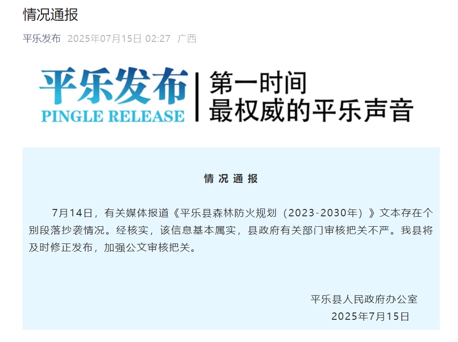7月14日,有關(guān)媒體報(bào)道《平樂縣森林防火規(guī)劃(2023-2030年)》文本存在個(gè)別段落抄襲情況。經(jīng)核實(shí),該信息基本屬實(shí),縣政府有關(guān)部門審核把關(guān)不嚴(yán)。我縣將及時(shí)修正發(fā)布,加強(qiáng)公文審核把關(guān)。