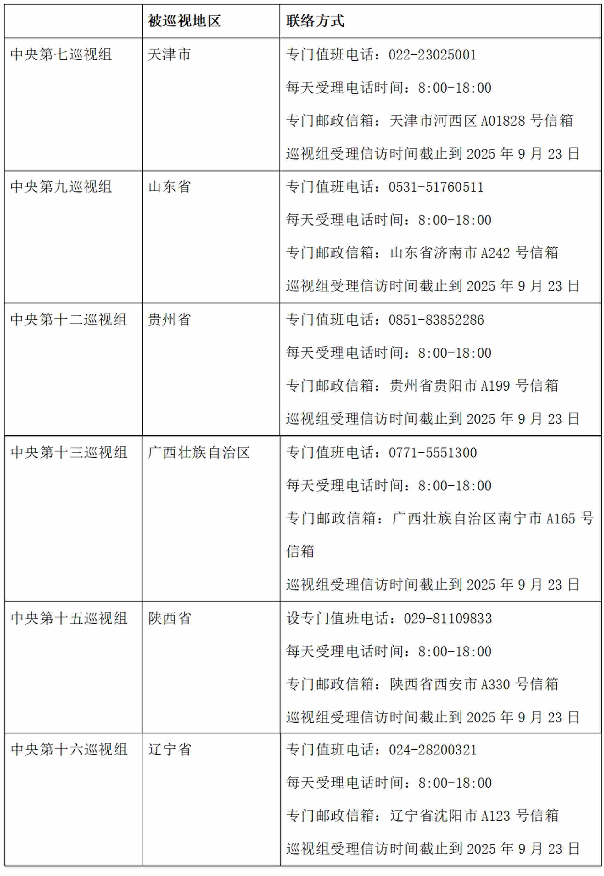 根據(jù)黨中央關于巡視工作的統(tǒng)一部署,近日,二十屆中央第六輪巡視的16個巡視組陸續(xù)開始進駐被巡視地區(qū),并公布了聯(lián)系方式。