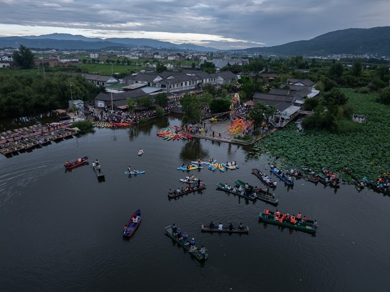 7月19日,人們在大理西湖歡度水上火把節(jié)(無人機(jī)照片)。