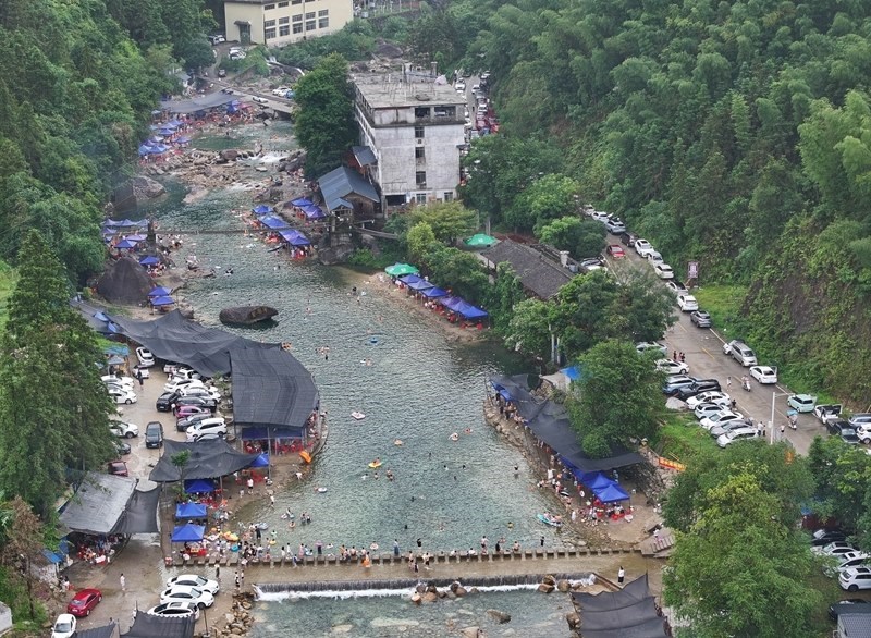 游客在融水苗族自治縣香粉鄉(xiāng)雨卜村戲水消暑(7月19日攝,無人機照片)。