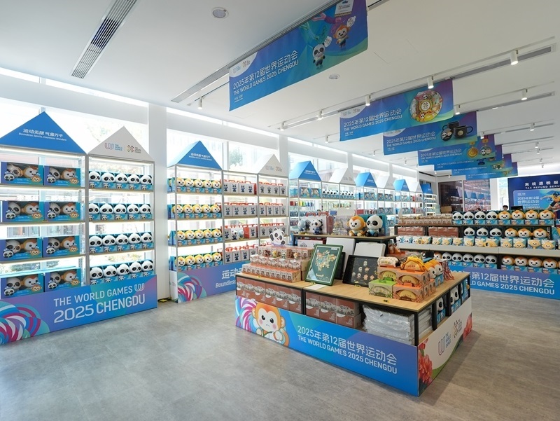 這是8月3日在成都世運(yùn)會運(yùn)動員村A區(qū)拍攝的官方特許商品零售店內(nèi)的紀(jì)念品。