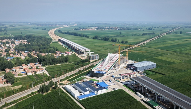 一輛列車駛向轉(zhuǎn)體完成的斜拉橋(8月6日攝,無人機照片)。