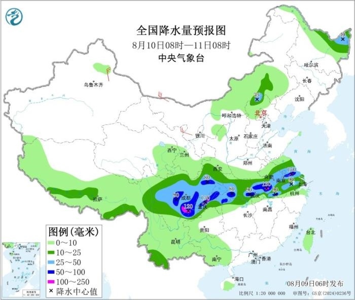 全國(guó)降水量預(yù)報(bào)圖(8月9日08時(shí)-10日08時(shí)) 圖片來(lái)源:中央氣象臺(tái)網(wǎng)站