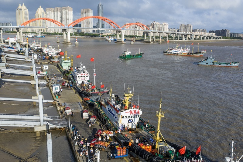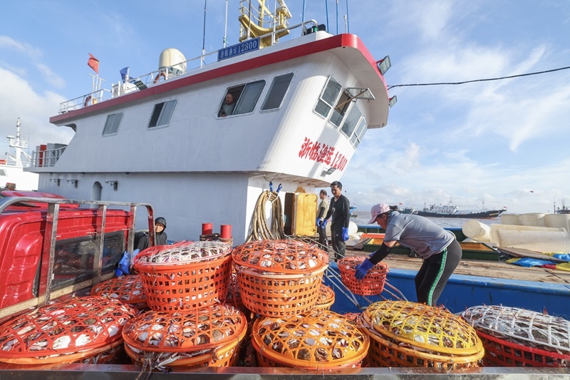 8月12日,開漁歸來的漁運(yùn)船靠泊在舟山沈家門舟山國際水產(chǎn)城碼頭,漁民把整筐的梭子蟹運(yùn)送上岸裝車。