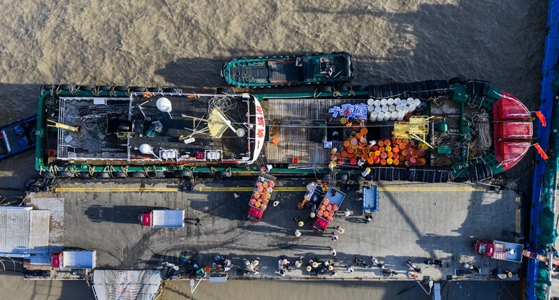 8月12日,開漁歸來的漁運(yùn)船靠泊在舟山沈家門舟山國際水產(chǎn)城碼頭,整筐的梭子蟹被運(yùn)送上岸裝車(無人機(jī)照片)。