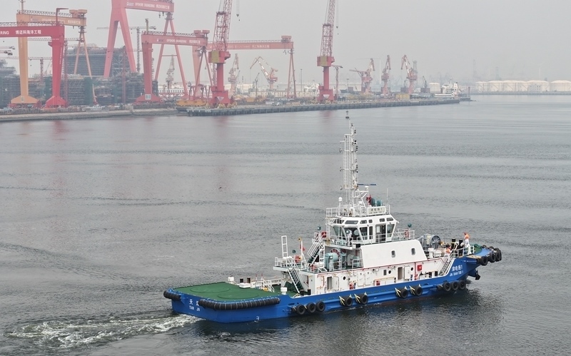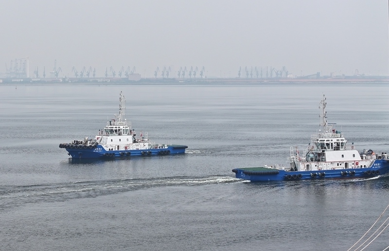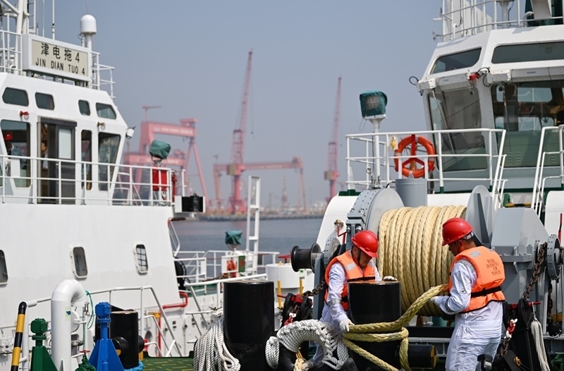 當日,由4艘純電動港作拖輪組成的“綠色艦隊”在中船天津碼頭鳴笛啟航。