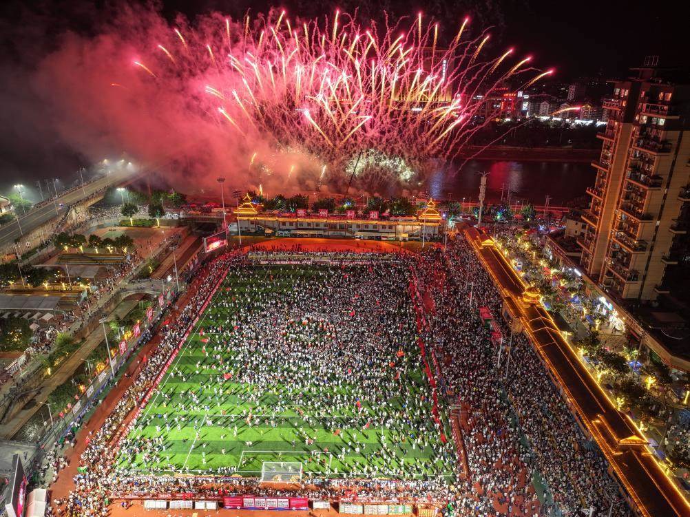 7月26日,貴州“村超”球場(chǎng)拍攝的煙花秀(無(wú)人機(jī)照片)。當(dāng)日,貴州榕江舉行主題為“感恩重啟·貴州超力量”的超級(jí)星期六活動(dòng),球星巴喬、卡洛斯現(xiàn)場(chǎng)助陣,助力“村超”重燃賽事,正式回歸。新華社記者 楊文斌 攝