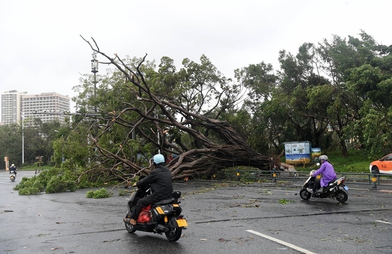 8月25日,在海南省三亞市吉陽區(qū),市民從倒伏的樹木前經(jīng)過。
