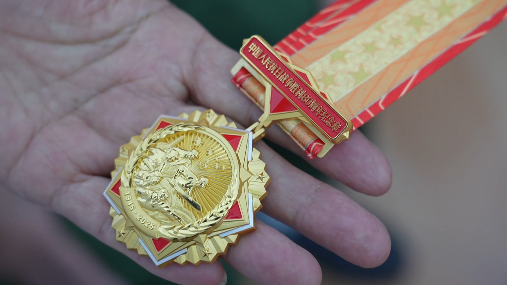 手捧“中國人民抗日戰(zhàn)爭勝利80周年”紀(jì)念章,