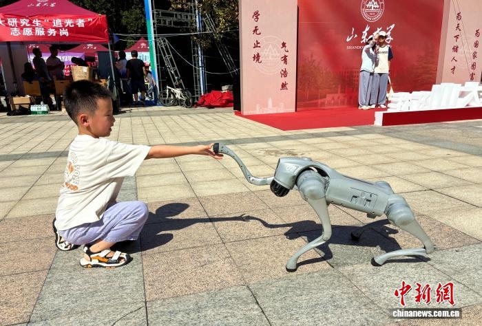 9月2日,山東濟南,一名小朋友在山東大學迎新現(xiàn)場和四足機器人握手。高藝芯 攝