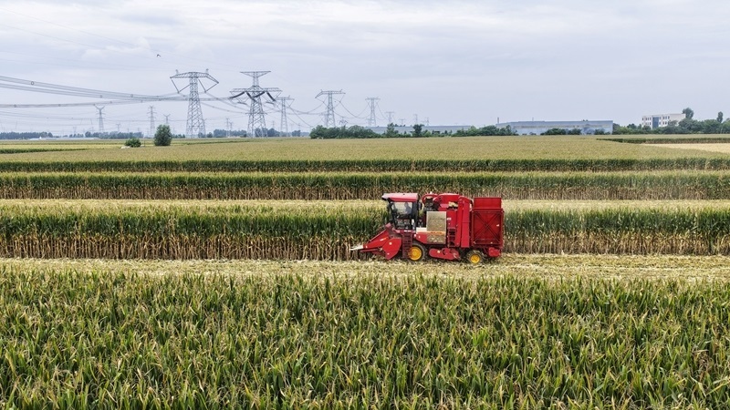 9月5日,農(nóng)民駕駛聯(lián)合收割機(jī)在山東省東營(yíng)市廣饒縣李鵲鎮(zhèn)黃東村的高標(biāo)準(zhǔn)農(nóng)田收割玉米(無(wú)人機(jī)照片)。