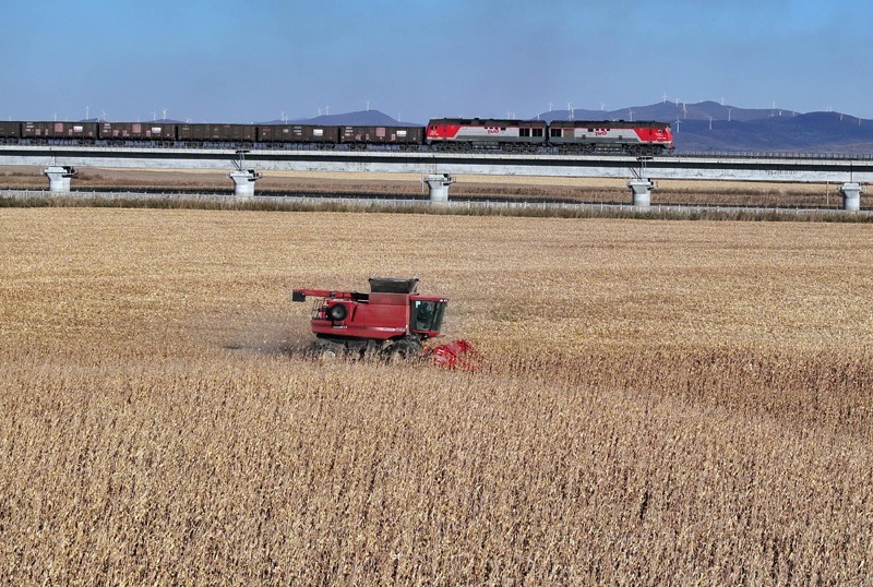 10月16日,滿(mǎn)載進(jìn)口物資的貨物列車(chē)駛向中國(guó)鐵路哈爾濱局集團(tuán)有限公司同江北站(無(wú)人機(jī)照片)。
