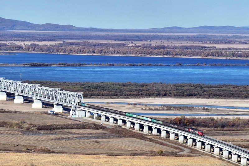 10月16日,滿(mǎn)載進(jìn)口物資的貨物列車(chē)通過(guò)同江鐵路大橋駛向中國(guó)鐵路哈爾濱局集團(tuán)有限公司同江北站(無(wú)人機(jī)照片)。
