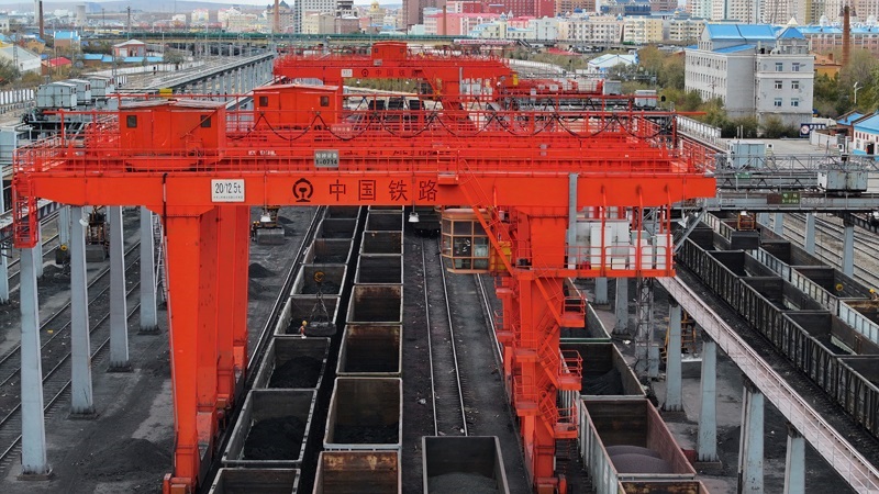 10月18日,在中國(guó)鐵路哈爾濱局集團(tuán)有限公司滿(mǎn)洲里站,機(jī)械化換裝場(chǎng)在對(duì)進(jìn)口貨物進(jìn)行換裝作業(yè)(無(wú)人機(jī)照片)。