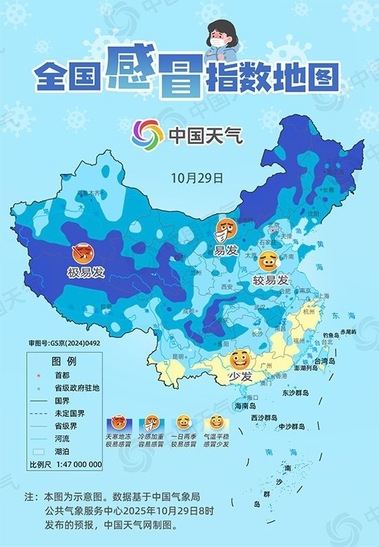 中國(guó)天氣網(wǎng)提醒,秋冬時(shí)節(jié)冷空氣活躍,氣溫多起伏,感冒多發(fā)。良好的生活習(xí)慣有助于預(yù)防感冒,建議大家日常生活中均衡飲食、適量運(yùn)動(dòng)、保證充足睡眠,避免過度勞累。同時(shí)在流感高發(fā)時(shí)期外出盡量戴好口罩,注意勤消毒,還可通過注射疫苗降低流感風(fēng)險(xiǎn)。(文/江漪 設(shè)計(jì)/王維一 數(shù)據(jù)支持/董靜舒 李寧 審核/祁保剛 劉紅欣 張慧 劉文靜 余曉芬)