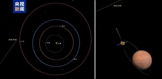 △星際天體阿特拉斯與天問一號(hào)火星環(huán)繞器相對(duì)位置示意圖(右圖是2025年10月3日相機(jī)拍攝時(shí)左圖的局部放大)