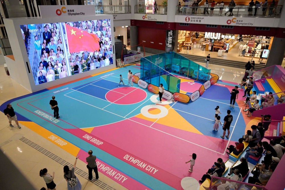11月9日,第十五屆全國運動會開幕式在廣東奧林匹克體育中心舉行,這是香港市民在一家商場內(nèi)觀看直播。新華社發(fā)(盧炳輝 攝)