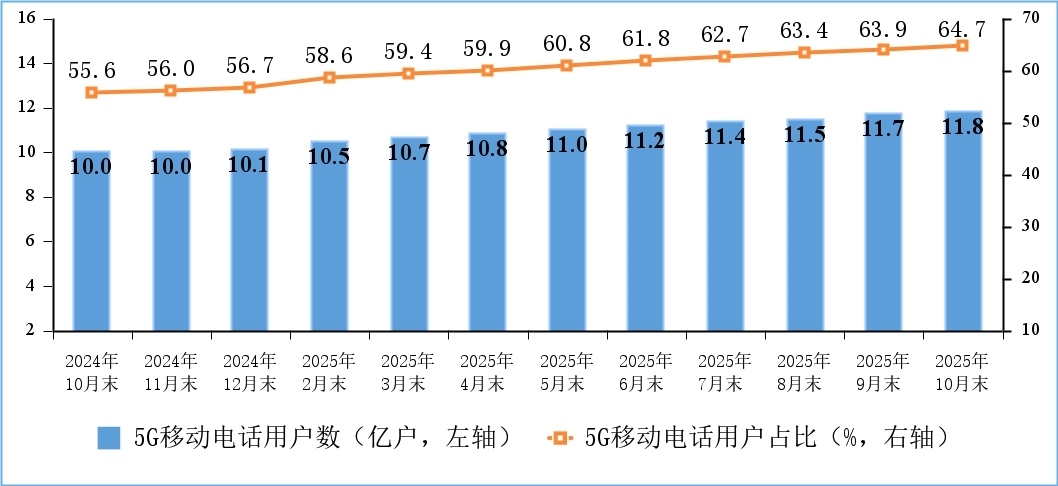 移動電話用戶規(guī)模穩(wěn)中有增,5G用戶數(shù)持續(xù)增加。截至10月末,三家基礎(chǔ)電信企業(yè)及中國廣電的移動電話用戶總數(shù)達(dá)18.3億戶,比上年末凈增4015萬戶。其中,5G移動電話用戶達(dá)11.84億戶,比上年末凈增1.7億戶,占移動電話用戶的64.7%。