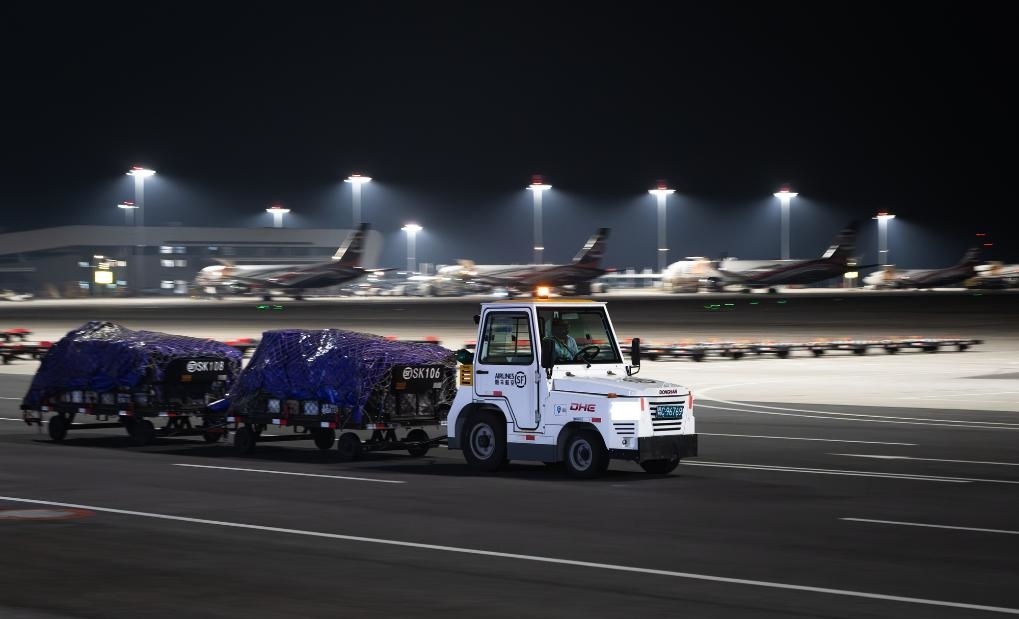 子夜時(shí)分,記者驅(qū)車(chē)來(lái)到這座機(jī)場(chǎng)時(shí),撲面而來(lái)的是一派“不夜空港”的繁忙景象:雪亮的停機(jī)坪上,貨機(jī)剛一停穩(wěn),工作人員便操控牽引車(chē)、加油車(chē)、轉(zhuǎn)運(yùn)車(chē)簇?fù)矶?,卸貨、加油、檢查,井井有條,一刻也不耽誤。