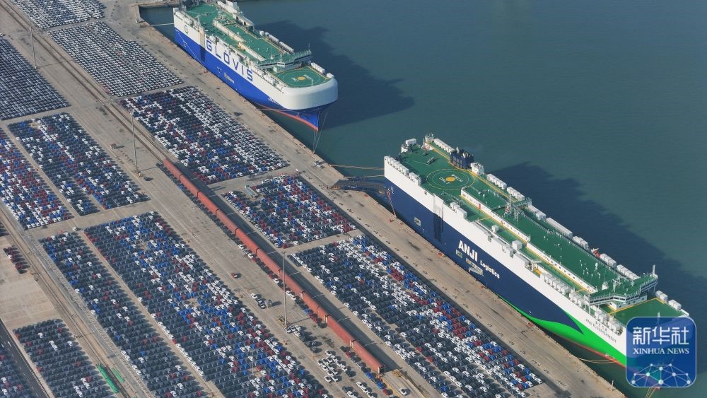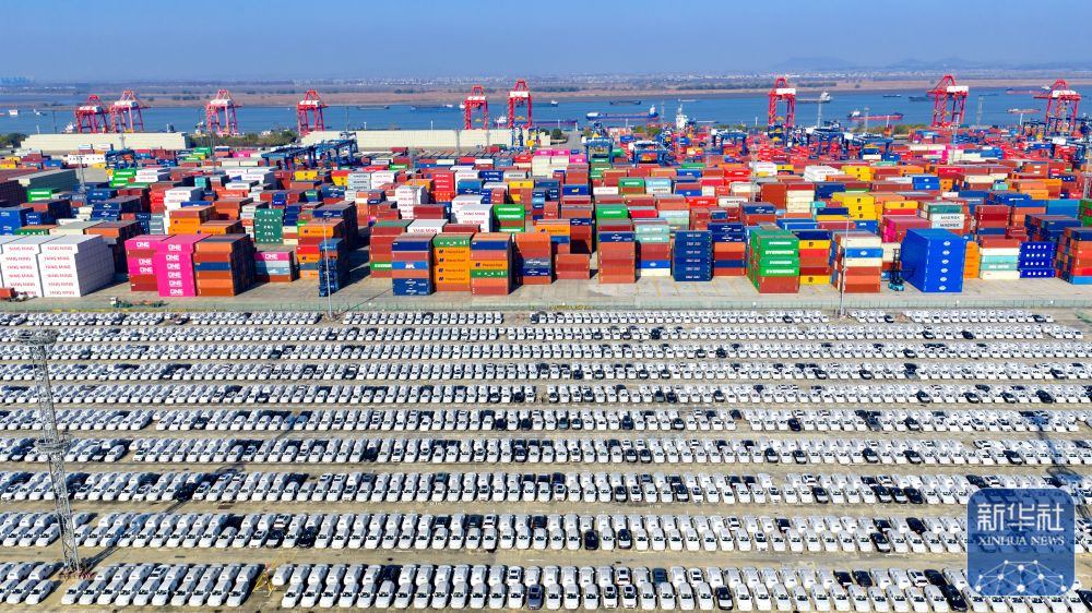 ↑ 12月14日在江蘇省港口集團(tuán)南京港龍?zhí)都b箱碼頭拍攝的等待裝船出口的國(guó)產(chǎn)汽車(無人機(jī)照片)。新華社發(fā)(楊素平攝)
