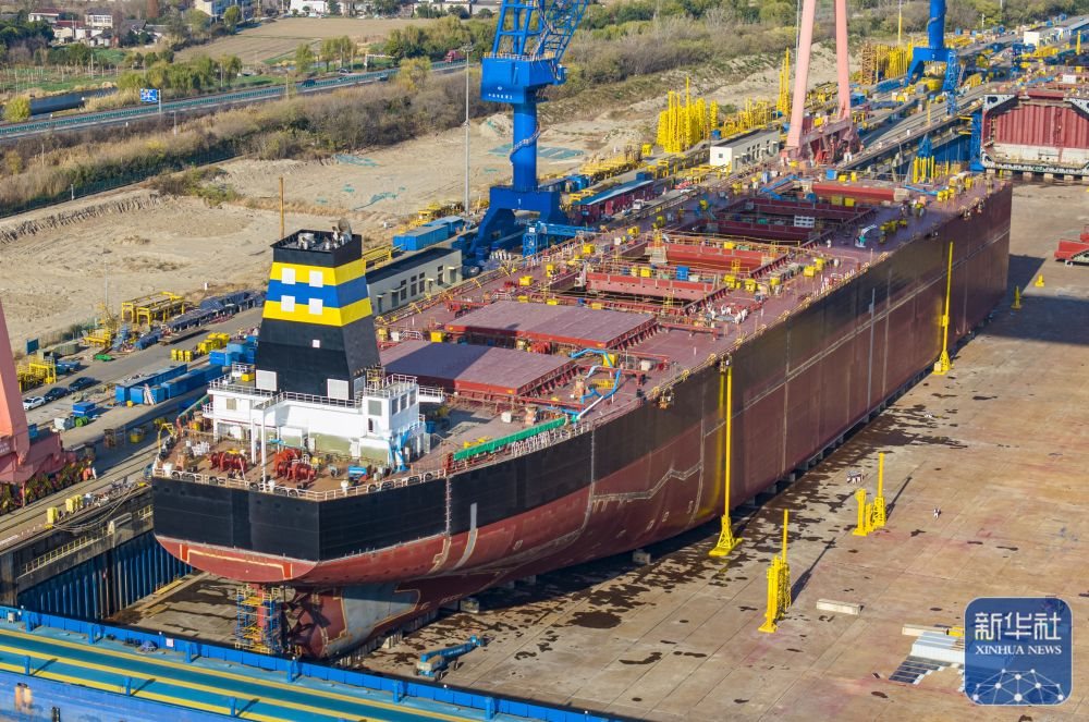 ↑ 12月15日,在江蘇南京招商工業(yè)南京金陵船廠生產(chǎn)廠區(qū),大型船舶在建造中(無人機(jī)照片)。新華社發(fā)(辛一攝)