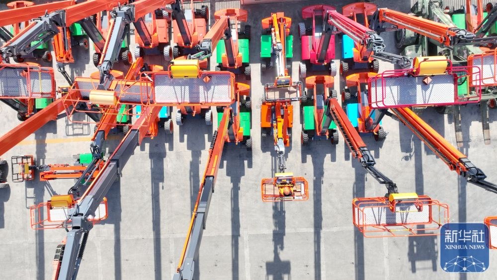 ↑ 12月15日,在位于浙江省湖州市德清縣雷甸鎮(zhèn)的浙江鼎力機(jī)械股份有限公司,工人對(duì)準(zhǔn)備出口的新臂式智能高空作業(yè)平臺(tái)設(shè)備進(jìn)行檢測(cè)(無人機(jī)照片)。新華社發(fā)(謝尚國(guó)攝)