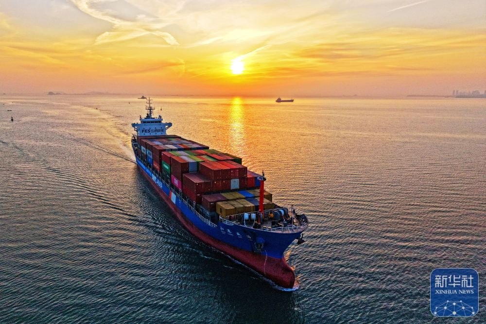 ↑ 12月15日,一艘集裝箱貨輪駛?cè)肷綎|港口煙臺(tái)港(無人機(jī)照片)。新華社發(fā)(孫文潭攝)