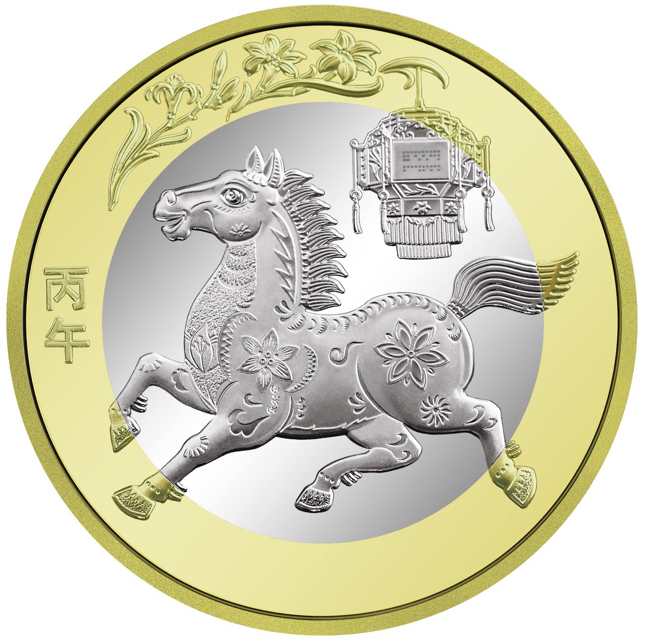 雙色銅合金紀(jì)念幣背面圖案為中國(guó)傳統(tǒng)剪紙藝術(shù)與裝飾年畫(huà)元素相結(jié)合的馬形象,襯以花燈和萱草圖案,幣面左側(cè)刊“丙午”字樣。