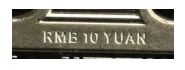 在硬幣正面面額數(shù)字“10”的底端,可觀察到“RMB 10 YUAN”的微縮文字。防偽特征效果見(jiàn)圖4。