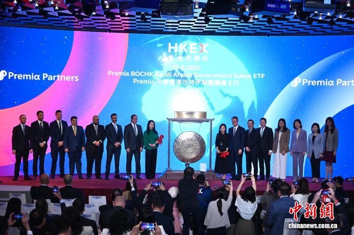2025年5月29日,香港交易及結(jié)算所有限公司與沙特阿拉伯證券交易所集團(tuán)在香港合辦“香港——沙特資本市場論壇”?,F(xiàn)場亦舉行Premia中銀香港沙特伊斯蘭國債交易所買賣基金(ETF)在香港上市的敲鑼儀式。圖為香港特區(qū)政府財(cái)政司司長陳茂波(右七)等嘉賓出席敲鑼儀式。 中新社記者 李志華 攝