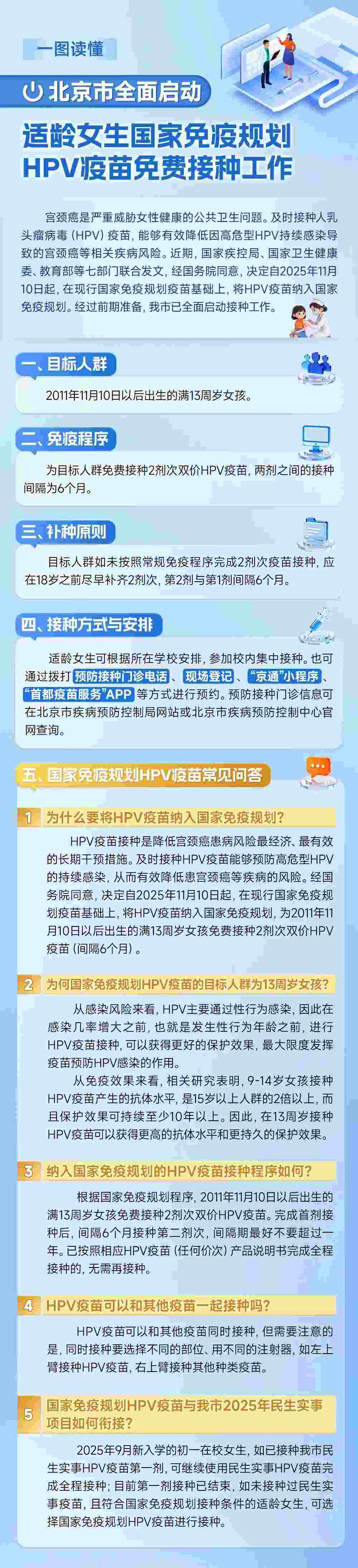 適齡女生可根據(jù)所在學(xué)校安排,參加校內(nèi)集中接種,也可通過撥打預(yù)防接種門診電話、現(xiàn)場登記、“京通”小程序、“首都疫苗服務(wù)”App等方式預(yù)約。預(yù)防接種門診信息可在北京市疾病預(yù)防控制局網(wǎng)站或北京市疾病預(yù)防控制中心官網(wǎng)查詢。