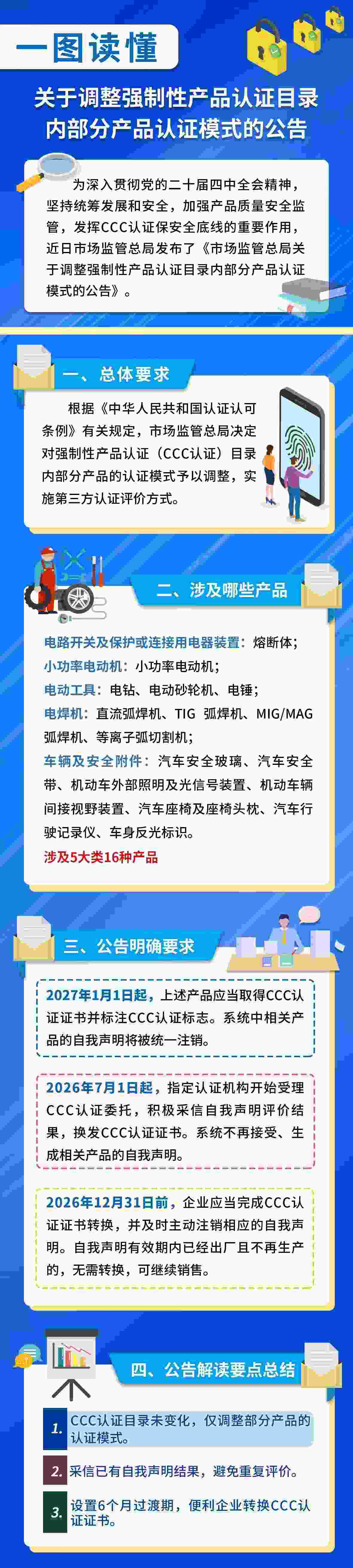 《公告》要求,2027年1月1日起,相關(guān)產(chǎn)品應(yīng)當(dāng)取得CCC認(rèn)證證書并加貼CCC標(biāo)志,方可出廠、銷售、進(jìn)口或者在其他經(jīng)營活動中使用。2026年7月1日起,指定認(rèn)證機構(gòu)開始受理相關(guān)產(chǎn)品的CCC認(rèn)證委托。