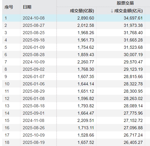 據(jù)Wind統(tǒng)計(jì),A股成交額突破3萬(wàn)億元此前總共發(fā)生了6次,分別是2024年10月8日,2025年8月25日、8月27日、8月28日和9月18日,2026年1月9日。