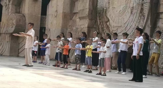 ▲家長(zhǎng)帶著孩子參加“乾源文化”打坐練功