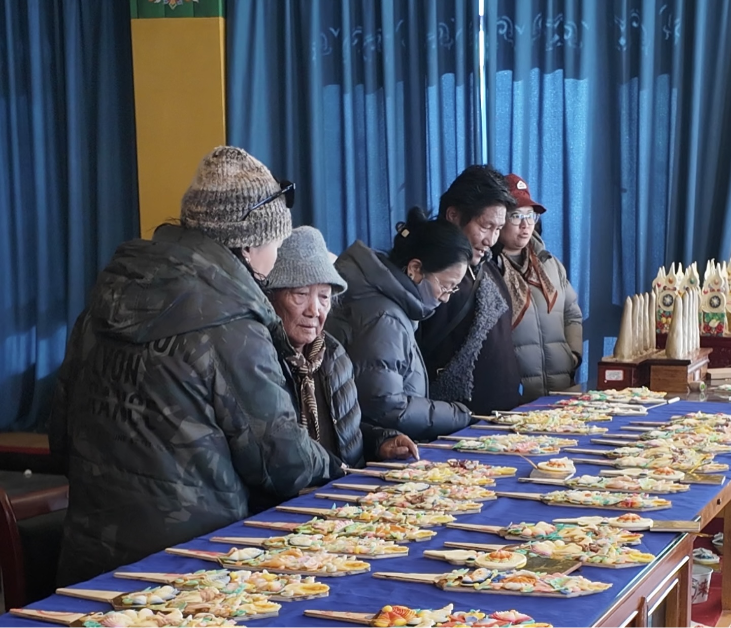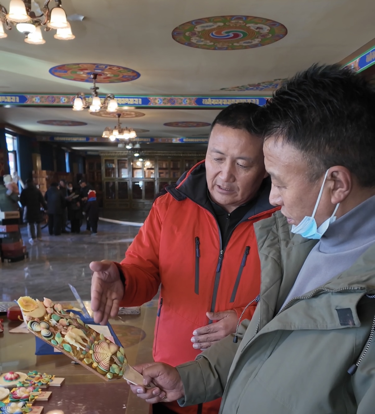 “哪種圖案寓意更好?”“‘八吉祥徽’和‘和睦四瑞’能搭配嗎?”問題接連不斷,倫珠忙得幾乎腳不沾地。他介紹,合作社于2025年11月成立,匯集了30多位手藝精湛的老師傅。為應對新年需求,大家提前一個月便開始制作,沒想到開售僅3天,1500多對酥油花便已售出,備貨幾乎告罄。