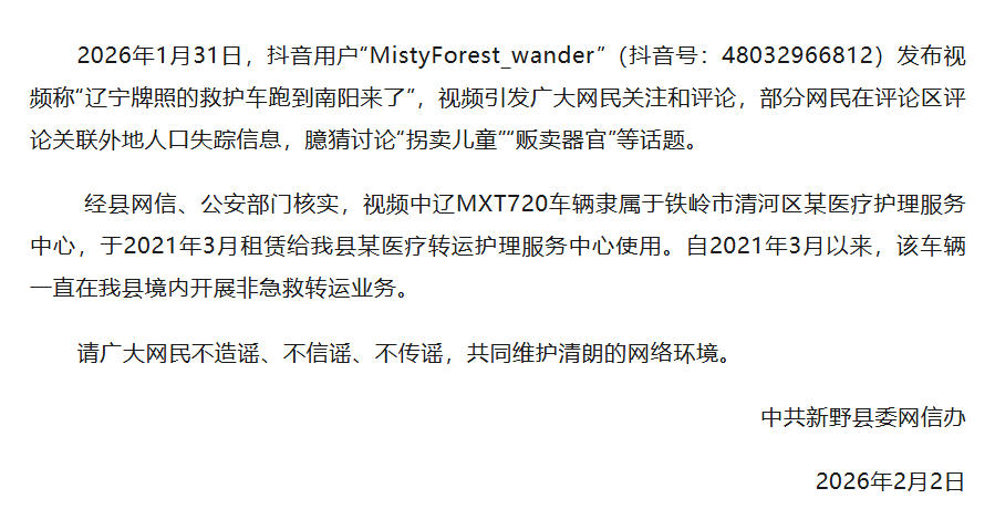 中國網(wǎng)2月2日訊 據(jù)“新野發(fā)布”微信公眾號消息,2月2日上午,河南省南陽市新野縣委網(wǎng)信辦發(fā)布情況說明稱,2026年1月31日,抖音用戶“MistyForest_wander”(抖音號:48032966812)發(fā)布視頻稱“遼寧牌照的救護車跑到南陽來了”,視頻引發(fā)廣大網(wǎng)民關注和評論,部分網(wǎng)民在評論區(qū)評論關聯(lián)外地人口失蹤信息,臆猜討論“拐賣兒童”“販賣器官”等話題。