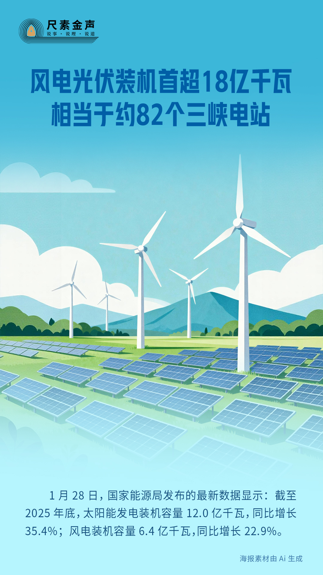 1月28日,國家能源局發(fā)布的最新數據顯示:截至2025年底,太陽能發(fā)電裝機容量12.0億千瓦,同比增長35.4%;風電裝機容量6.4億千瓦,同比增長22.9%。