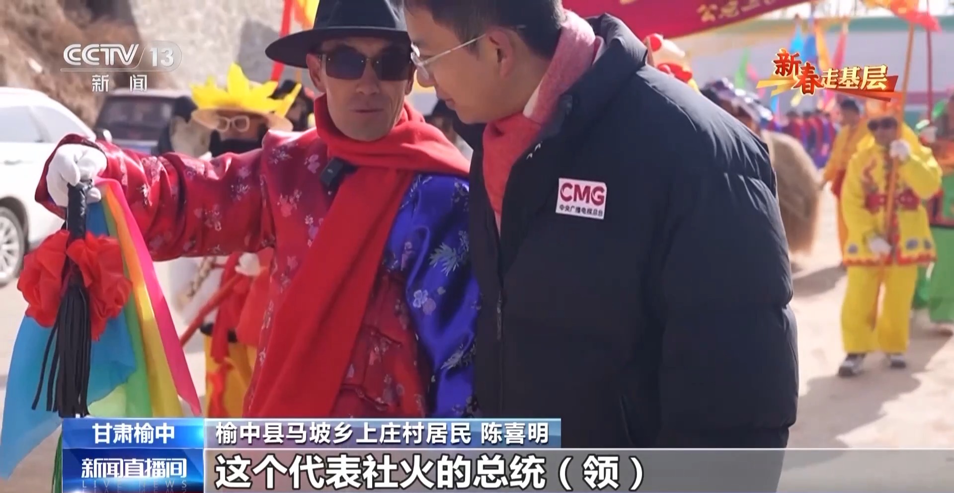 榆中縣馬坡鄉(xiāng)上莊村居民 陳喜明:這個代表社火的總統(tǒng)領(lǐng),是給我們引場子的,社火就是把大家召集到一起,前段時間這里遭災,搞個社火把大家的精神提一提。
