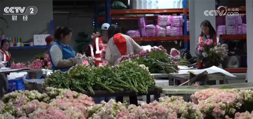 商家介紹,本月出口鮮花的發(fā)貨量是日常的五倍,目前訂單已經(jīng)排到年后。新鮮采摘的鮮花在出口商車間完成分揀、包裝、保鮮等處理后,由冷鏈送往機(jī)場(chǎng)過(guò)關(guān)出口,整個(gè)流程最快不到20小時(shí)就能完成。