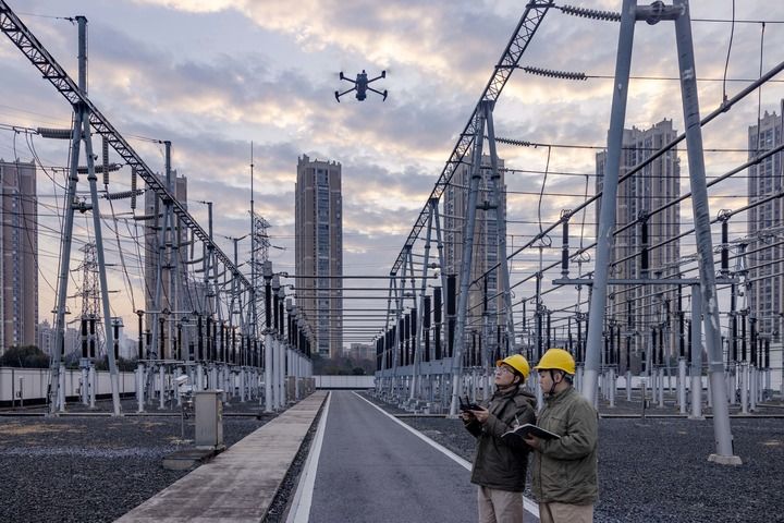 2月17日,國(guó)網(wǎng)泰州供電公司運(yùn)維人員在220千伏寺巷變電站利用無人機(jī)巡檢電力設(shè)備。新華社發(fā)(湯德宏 攝)