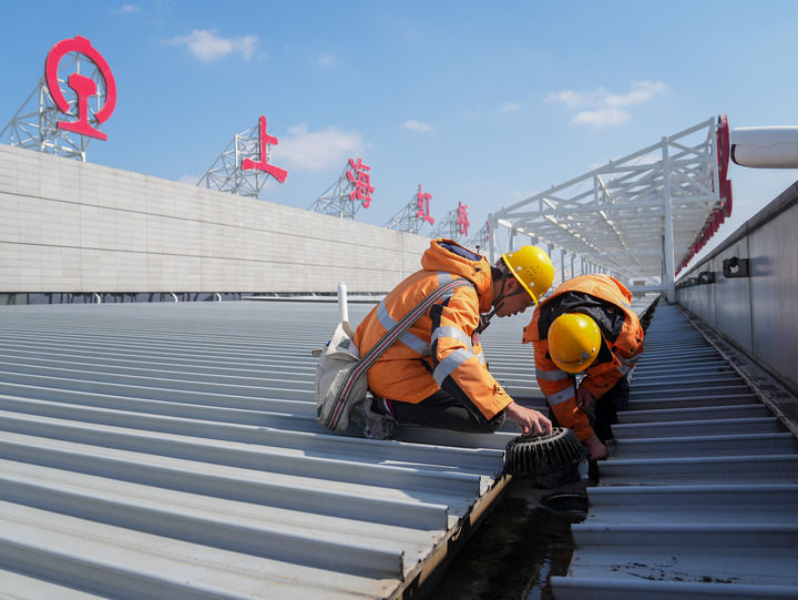 2月17日,中國(guó)鐵路上海局集團(tuán)有限公司上海房建公寓段的工作人員在上海虹橋火車站的屋面鋼結(jié)構(gòu)上清理垃圾。新華社記者 丁汀 攝