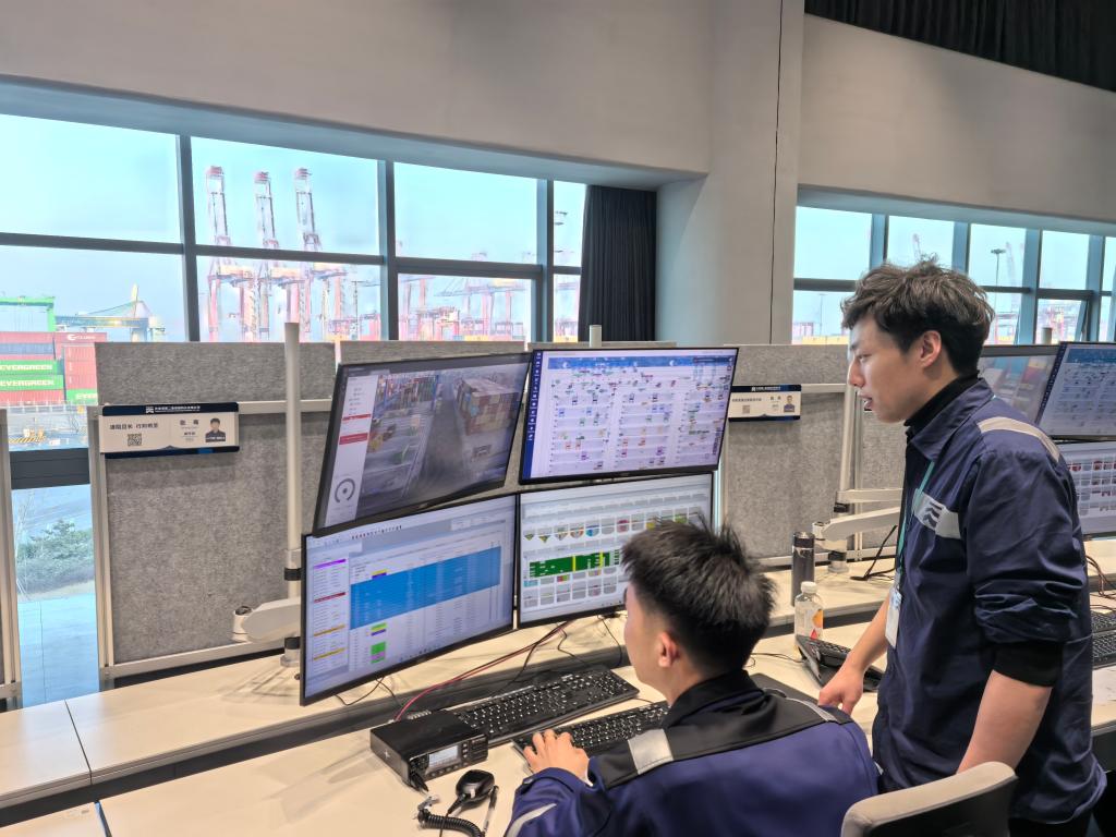 天津港第二集裝箱碼頭有限公司信息部副經(jīng)理班宏宇(右一)正在和調(diào)度員討論堆場(chǎng)智能系統(tǒng)應(yīng)用情況。新華社記者 楊文 攝