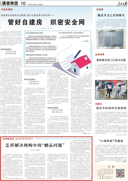 2022年6月6日,《人民日報(bào)》讀者來信版“百姓關(guān)注”欄目《怎樣解決網(wǎng)購中的“贈品問題”》一文則關(guān)注了“人民投訴”平臺用戶“下單時(shí)頁面顯示有贈品卻未收到,客服回應(yīng)是贈品有限、隨機(jī)抽取買家”等線上商家的失信行為。
